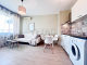 Layout: entrance hall, bright living room with kitchen and dining area, one bedroom. A big balcony with pool view