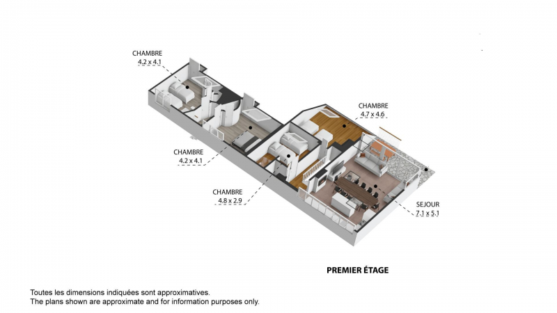 Each property has 5 bedrooms and multiple bathrooms, with glass patio doors opening on to the exquisite terraced garden with babbling brook and private bridge accessing the footpath to the Prarion ski lift and local transport. An additional terrace and private corner provides a private area for barbecues and/or a hot-tub, the perfect spot from which to watch the Prarion cable car passing over the trees at the edge of the garden.