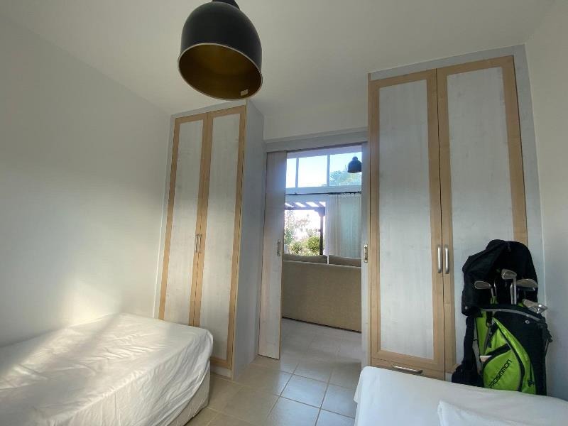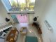 The apartment offers comfortable living with two double bedrooms; The master suite is set on a charming mezzanine level with access to a family bathroom, while the second double bedroom and  shower bathroom are conveniently located on the ground floor. Tall glass sliding doors and double high placed windows flood the interior with natural light and look onto a large terrace overlooking the beautifully landscaped gardens — the perfect place to relax and enjoy the view.