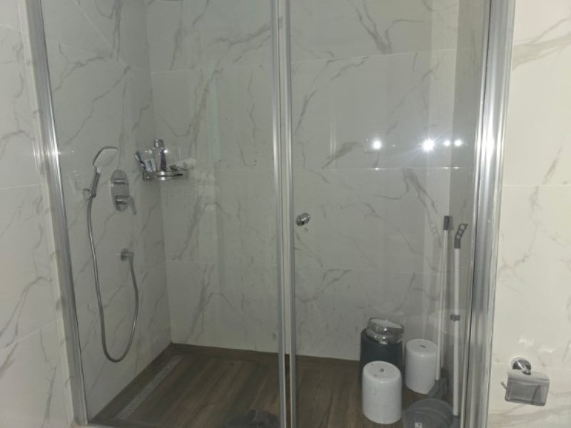 The family bathroom is of high-quality tile finishing with a tall walk in shower, a large basin and a w/c.