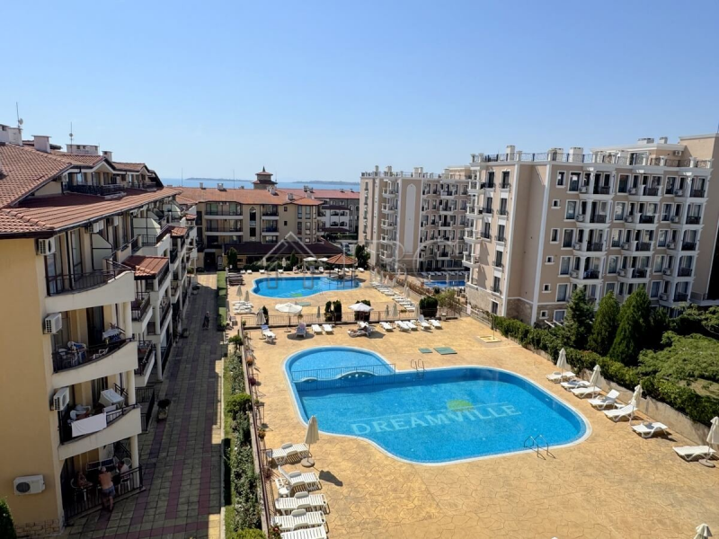 IBG Real Estates offers a spacious two-bedroom apartment in the gated Aqua Dreams complex, located on the second line from the beach in Sveti Vlas. This 100 sq.m. apartment is situated on the fourth floor of a 5-storey building and features a comfortable layout with an entrance hall, living room with kitchenette, two bedrooms, two bathrooms, and two terraces. One terrace offers sea and pool views, while the other provides mountain views. The apartment is sold fully furnished and equipped, ready to move in or rent out.