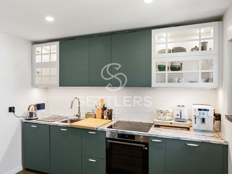 Fully equipped kitchen, two bedrooms facing east and west, both with built-in wardrobes, one full bathroom with walk-in shower, and an additional guest WC.
