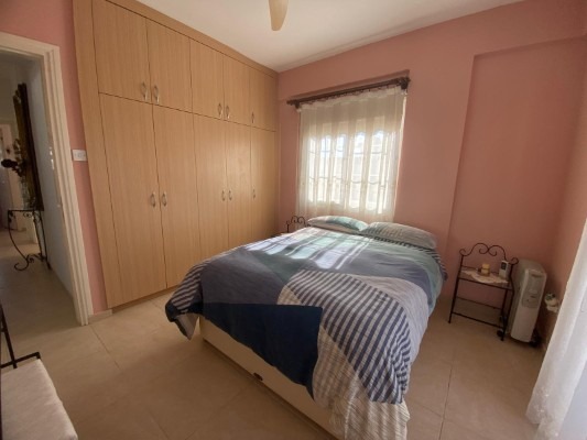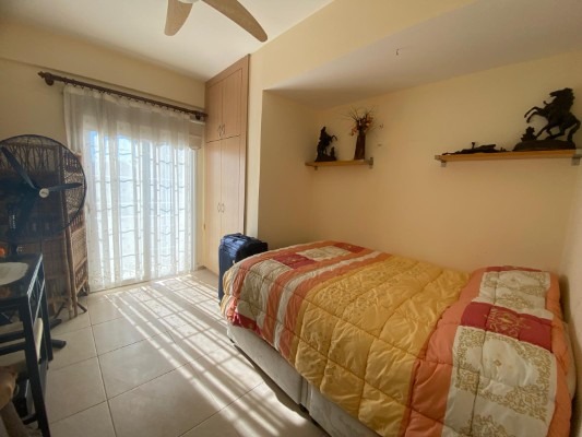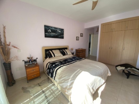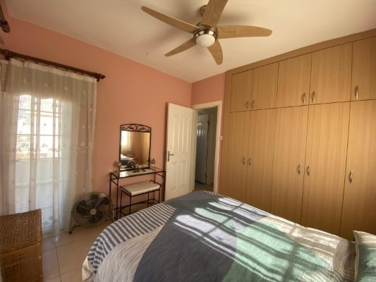 A double bedroom in ceramic flooring, fitted wardrobes, ceiling fan and 2 sliding doors opening up to 2 small balconies overviewing the surrounding area.