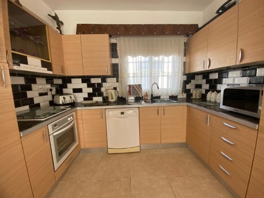 A fully fitted kitchen in wooden effect cabinets and black worktop. All white goods are included as well as a window and a door leading to the back garden.