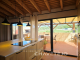 Towards the back of the house, things open up into a much more contemporary living space. The kitchen and dining area are arranged in open plan, with plenty of natural light coming through large glass doors that connect straight to the outside. The kitchen itself is modern and well equipped, centred around a solid island with white granite worktops and complemented by an American-style fridge. One of the nicest details is the old wood oven, kept in place as a decorative feature, which gives the space a bit of soul. From here, you step out onto a sheltered patio area with a barbecue and wooden pergola, ideal for long meals outside or simply enjoying the surroundings.