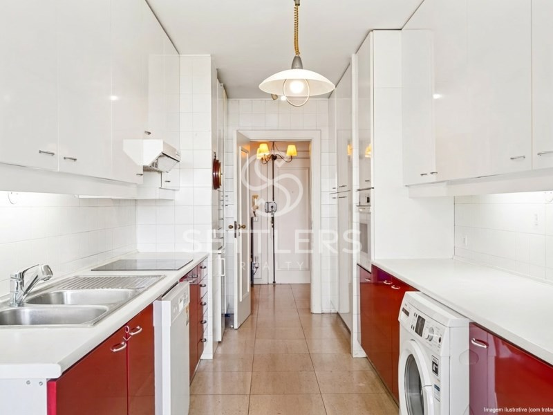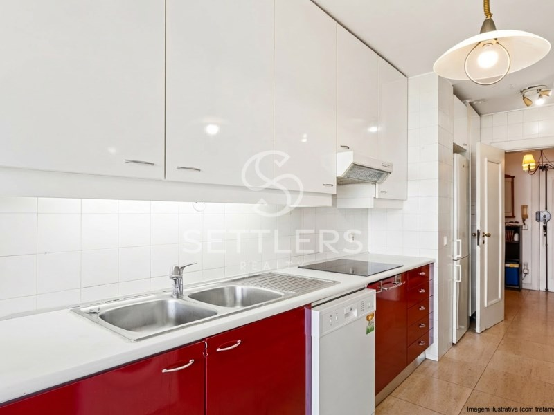 Living room, facing east, (37.90 m²) with access to balcony (7.40 m²), providing excellent brightness, kitchen (15.20 m²) with unobstructed view to the Serra de Sintra, suite (19.80 m²) with full bathroom with bathtub, two bedrooms (12.10 and 11.10 m²) and full bathroom supporting the bedrooms with shower base (3.60 m²).