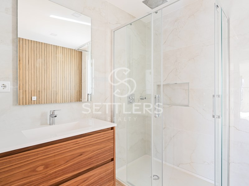 Upper floor: Master suite (27.52 m²) with south-facing balcony, walk-in closet and full bathroom with shower tray, double washbasin and window, 2 suites (20.89 m² and 19.92 m²) with balcony, wardrobe and full bathroom with shower tray.