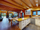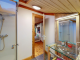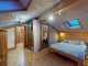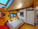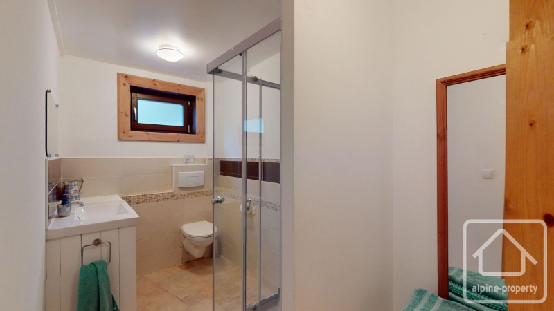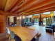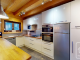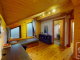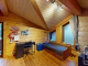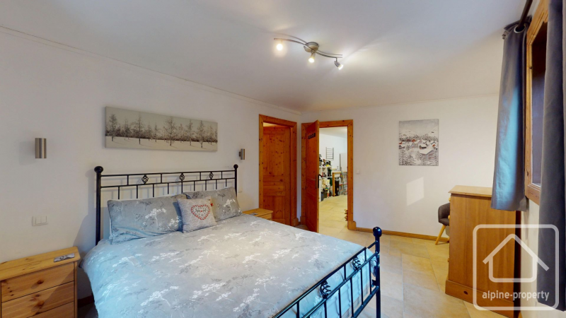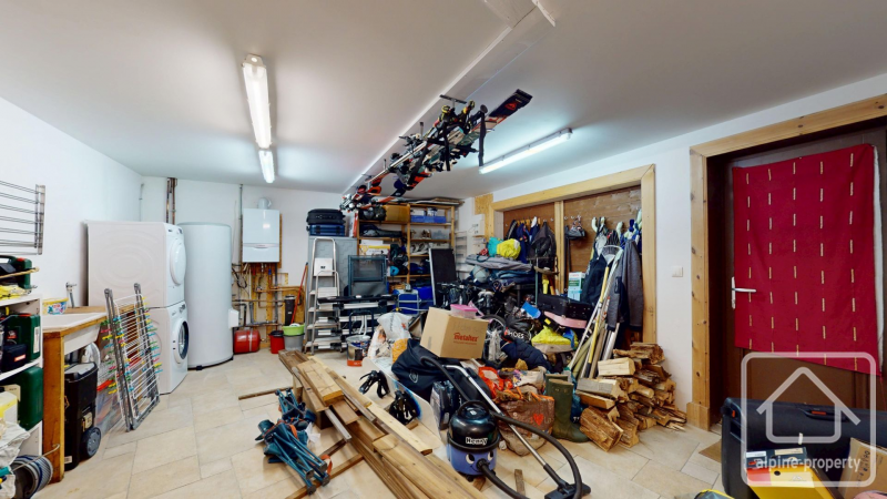 **Garden level:** entrance into second living room with south-facing balcony, guest WC, fully equipped open-plan kitchen onto dining area and cathedral height primary living room with multiple glass openings, views of the ski pistes, opening onto a large wooden terrace and private garden facing west. A wood burning stove was installed in 2025 for added ambiance on cosy winter nights.