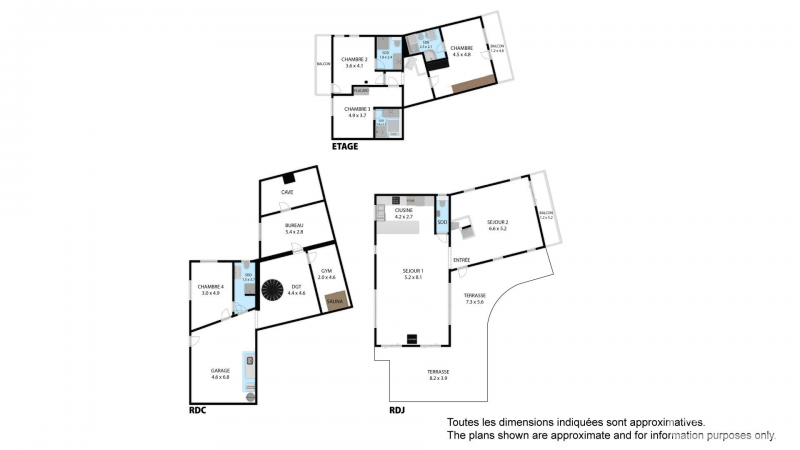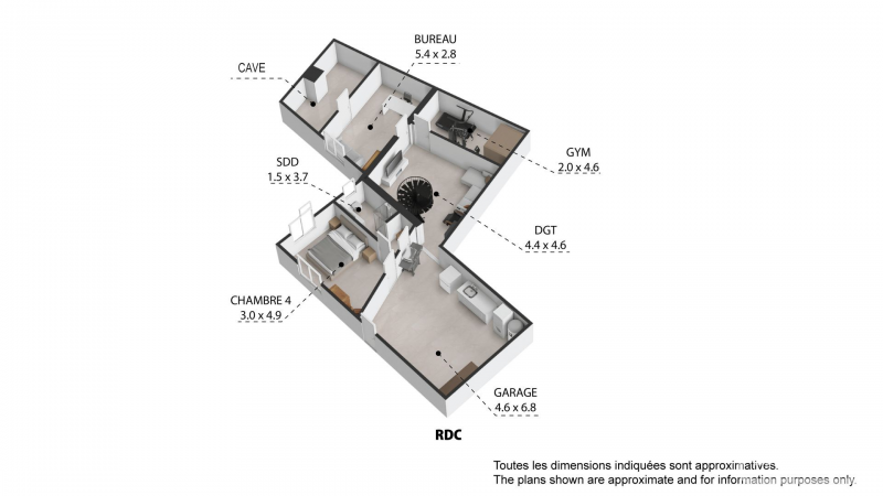 **Lower level:** chill out zone, gym with sauna, office, storage room, double garage, fourth double bedroom with ensuite.