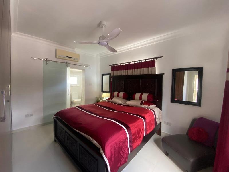 The master suite features a king bed, full wall fitted wardrobes, an air conditioning unit and a ceiling fan for additional comfort. It also accesses a private en suite.