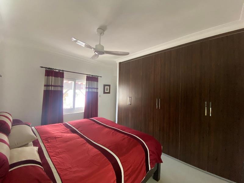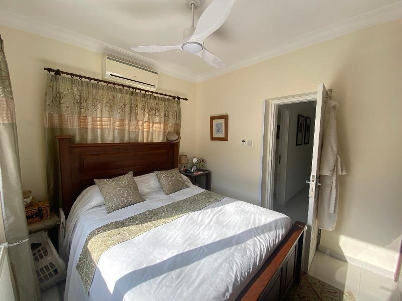 The second bedroom features a fitted wardrobe, air conditioning unit, and a ceiling fan, with a window overlooking the front of the house. Two sets of double windows ensure plenty of natural light and allows fresh breeze.