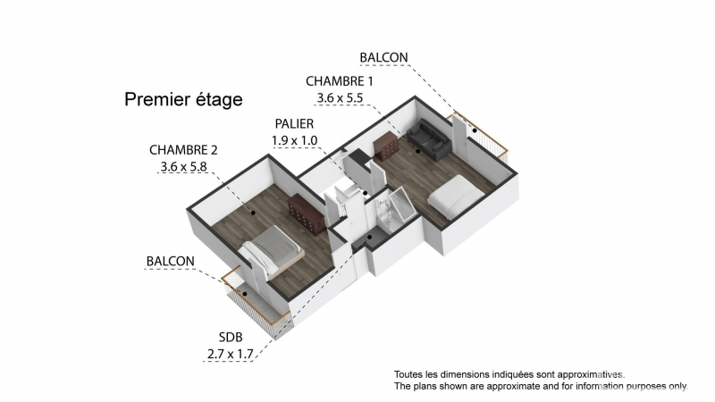**Upstairs**, there are two additional bedrooms with a balcony each, and a bathroom.