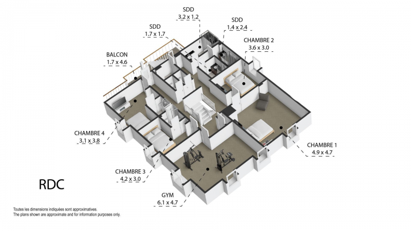 **First floor:** Two ensuite double bedrooms, three further double rooms, three separate toilets, three separate shower rooms, fully equipped gym, balcony.