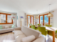 **On the ground floor,** an open plan living, dining, kitchen area with access to the sunny, wraparound terrace and balcony, entrance with storage cupboard, WC.
