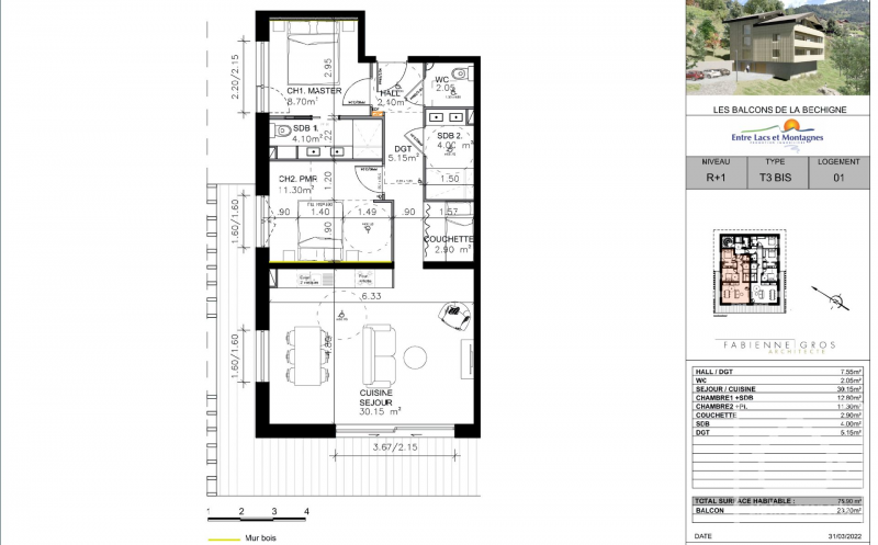 Apartment A11 (01), on the first floor, is a two bedroom property with extra coin montagne sleeping area. It benefits from 75.90 sq m of habitable space, a balcony of 23 sq m, a garage and ski locker. The total price (including garage and kitchen) is 599.800 €.