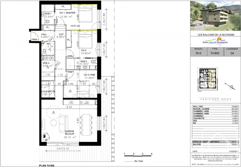 Apartment A22 (04), on the second floor, is a three bedroom property with extra coin montagne sleeping area. It benefits from 94.75 sq m of habitable space, a balcony of 23 sq m, a garage and ski locker. The total price (including garage and kitchen) is 798.800 €.