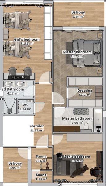 • Master bedroom 15.25 m2 – dressing room 5.7 m2 - bathroom 6.66 m2
