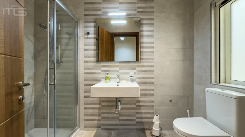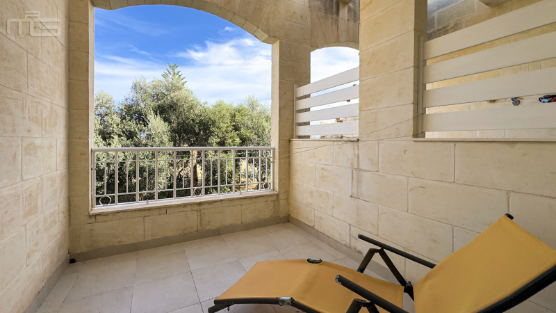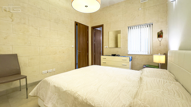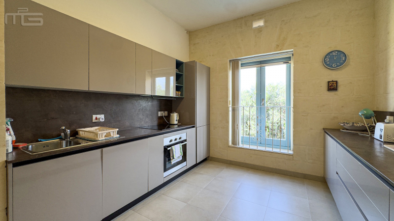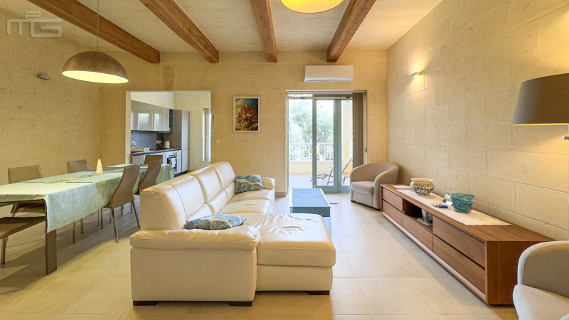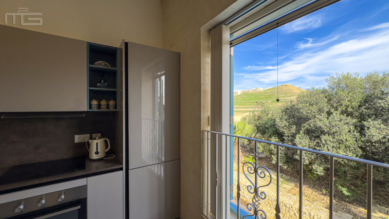 The main living space is generous and thoughtfully designed. The living and dining areas form an open-plan layout, creating an inviting atmosphere ideal for relaxing or entertaining. The kitchen sits just off the dining area, connected by a wide opening that gives it a semi-separate feel while still flowing naturally with the rest of the space. From here, the apartment enjoys beautiful views over the communal pool, the lush surrounding countryside, and up towards the village of Żebbuġ, with partial side views extending towards the sea.