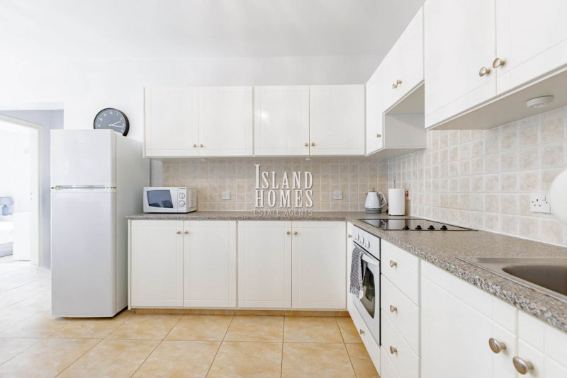 Set on the first floor, accessible by lift or stairs in a well maintained block, this beautifully presented apartment is in great condition. The front door enters into the open plan kitchen, dining and living area with patio door access to the balcony. The balcony has a pool view and is a nice extension of the living area when you are searching for a breeze during the summer or to enjoy the winter sun at other times of the year. Both double bedrooms include fitted wardrobes, window shutters and ceiling fans to ensure you stay cool during the summer evenings. The modern bathroom has been tiled in neutral ceramics and includes a bathtub, over bath shower, WC and feature sink which sits atop a large vanity unit, ideal for those spare toiletries and towels.