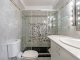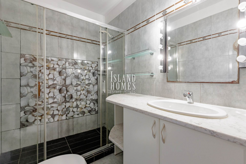 The bedroom is double in size, includes floor to ceiling fitted wardrobes and also offers a sea view. The bathroom benefits from a large walk in shower, WC, sink with handy vanity unit and mirror with stage lights all finished in a grey ceramic tile and marble effect counter top.