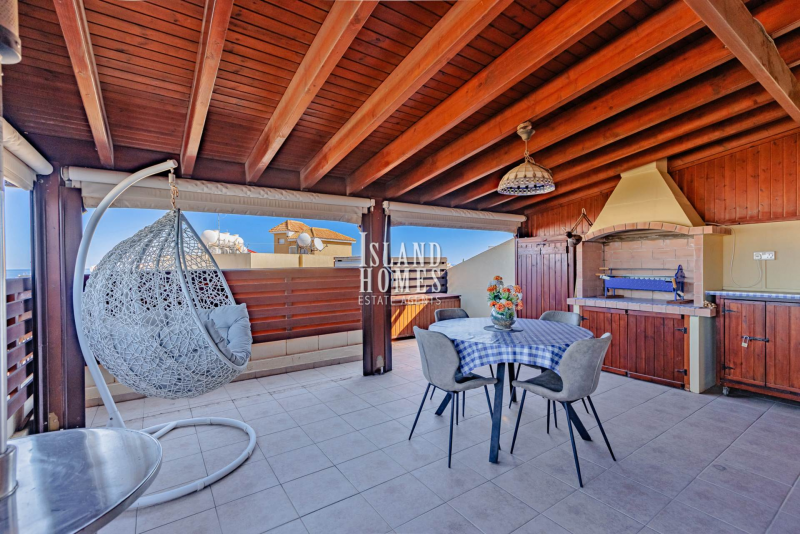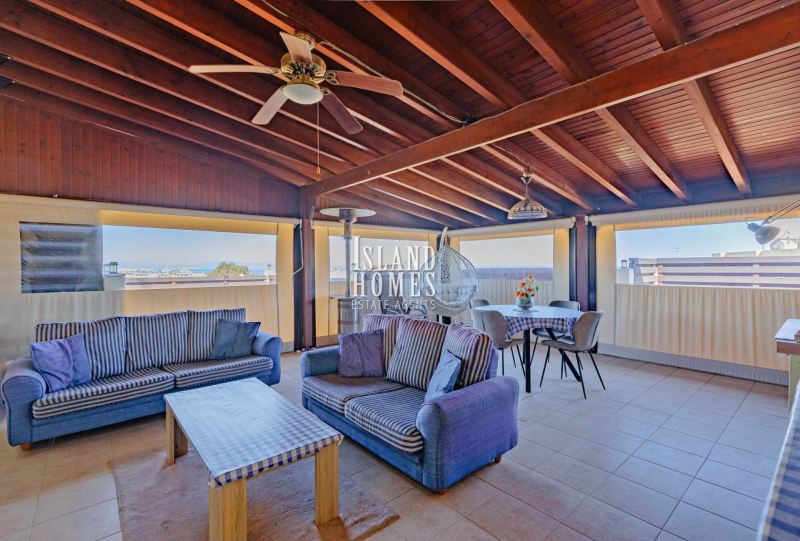The real gem of this property is the 62m2 veranda with practically panoramic sea views. The current owners have transformed this space into a beautiful extension of their home with a large wooden roof spanning the majority of the veranda, offering a great escape from the summer sun. This nicely presented veranda includes roller shutters to allow for year round use. Incorporating a built in BBQ area, storage cupboards, dining area, seating area, ceiling fans, a patio heater and even a TV on the wall, this really is an additional room at the property. There is also an uncovered area of the veranda which allows for sunbathing or dining al fresco under the stars.