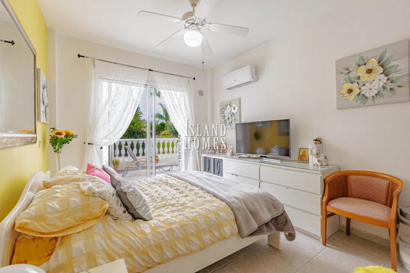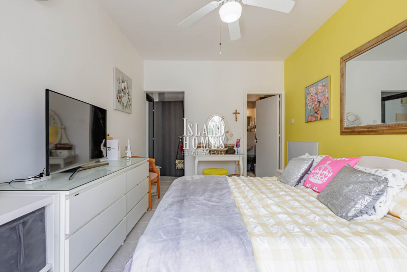 The living area benefits from patio doors leading out to a spacious veranda, complete with an electric canopy ideal for creating shade during the long, hot summer months. The main bathroom offers a bathtub, overhead shower, sink, and WC. A short corridor leads to two generously sized double bedrooms, both fitted with ceiling fans. The master bedroom further benefits from a nicely sized en-suite shower room.