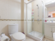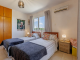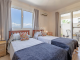 The bedroom, currently arranged as a twin room by the owners, is a well sized double and includes fitted wardrobes for ample storage. It also benefits from both a window with sea views and direct patio door access to the veranda, enhancing the light and airy feel of the space. The bathroom is well appointed with a shower cubicle, WC, and a sink set within a practical vanity unit for additional storage.
