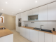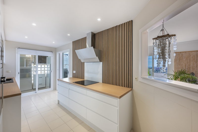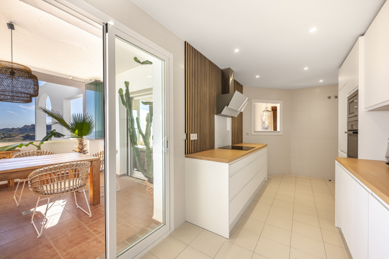 The modern, fully equipped kitchen connects seamlessly to a charming breakfast terrace, creating a warm and inviting space for family and friends.