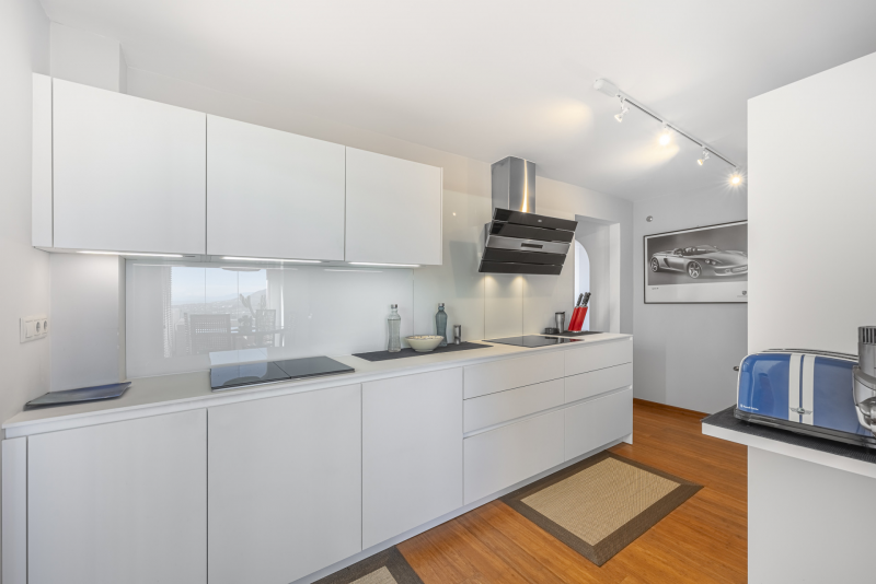Step into bright, open interiors designed for modern living. The spacious living and dining area with a cozy fireplace opens onto a large approx 35 m2 sunny terrace – the perfect spot to enjoy panoramic views towards the sea and the mountains. The modern, fully equipped kitchen connects seamlessly to the dining area creating a warm and inviting space for family and friends. A laundry with access from the kitchen is also provided. The master suite offers an elegant en-suite bathroom and has access to another terrace (approx 25 m2) with glass curtains which can be opened and closed fully and is used currently as a home gym. A second bedroom provides comfort for guests. High-quality finishes in the whole apartment and air conditioning (hot/cold) complete this exceptional home.