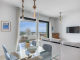 The open-plan living and dining area with a modern integrated kitchen forms the heart of the home. Floor-to-ceiling windows flood the interior with natural light and lead directly onto the spacious terrace.