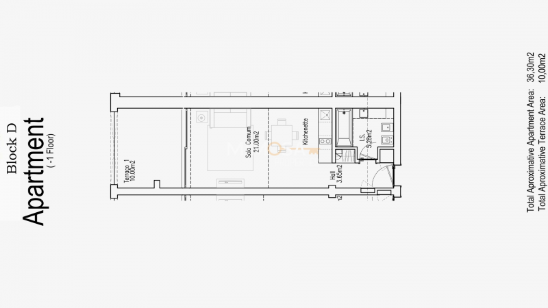 The apartment has a welcoming and practical entrance hall, living room, kitchen and bedroom combined in an open space, connecting to the large balcony overlooking the pool. The complete bathroom has a bathtub.