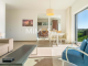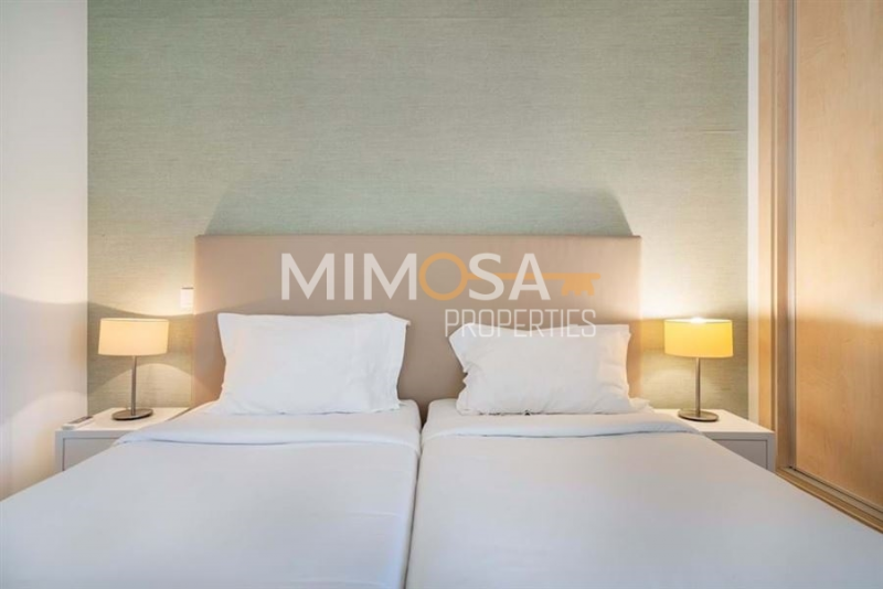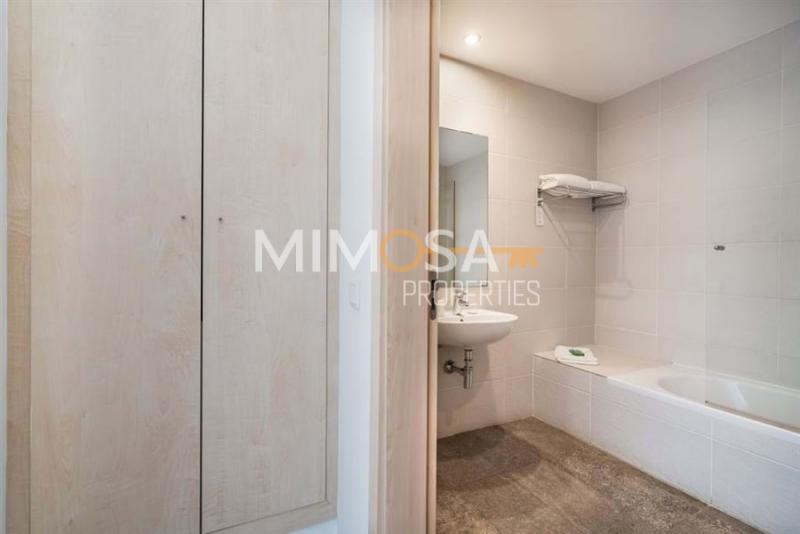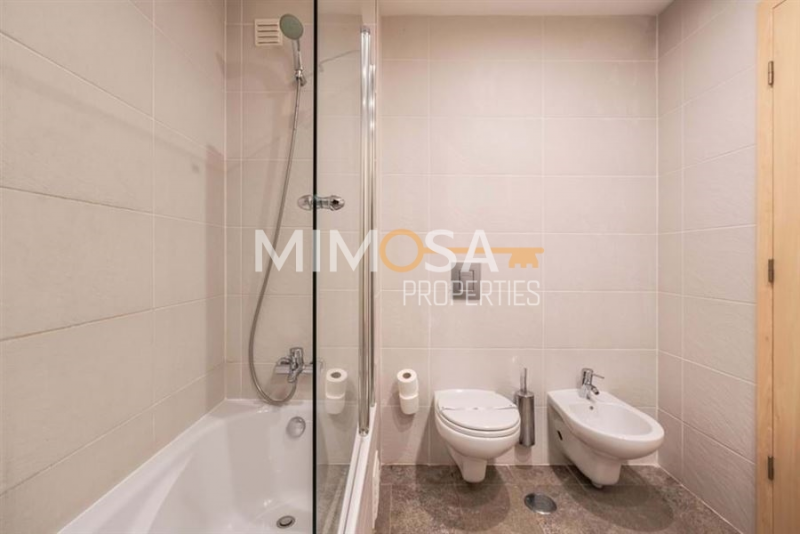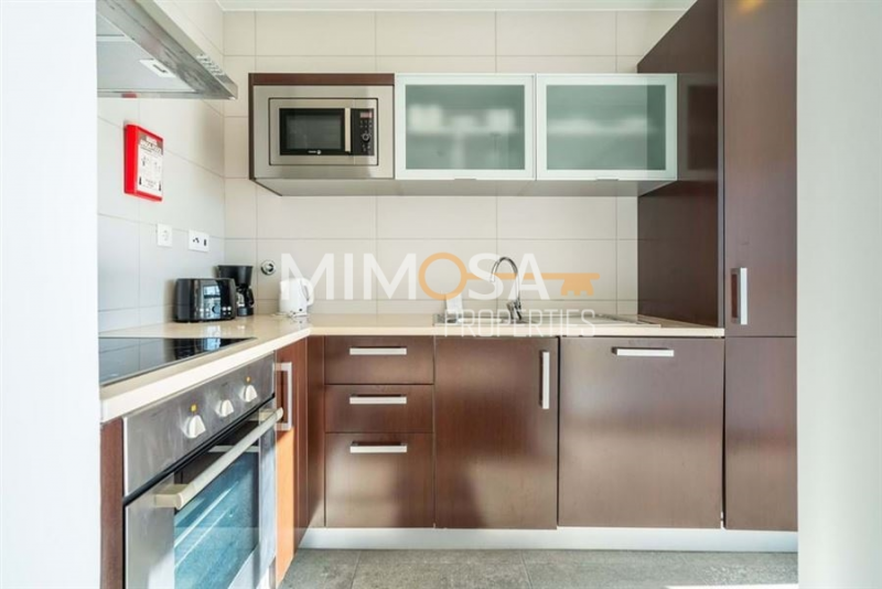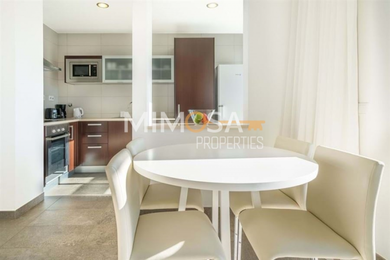 All the apartments are bright, modern, and spacious. Entrance, hallway, living room, fully equipped kitchen, one bedroom and one bathroom. Each apartment has its own parking space as well as storage. The owners have access for a small fee to the different facilities the complex offers like an outdoor pool, indoor pool, spa, and gym,