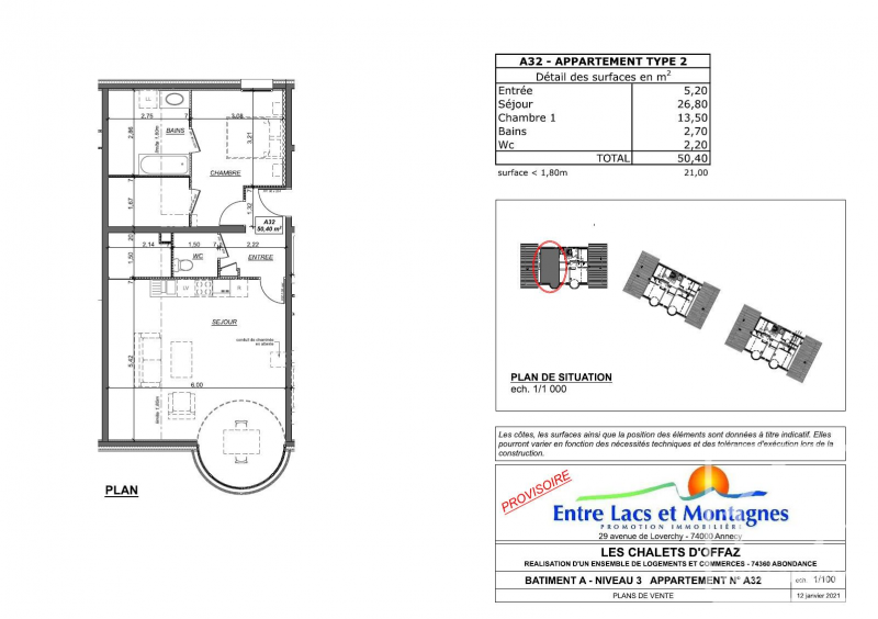 Apartment A32 is a one bedroom apartment of 50.40 sq m (with an extra 21 sq m under the eaves). Located on the third floor it comprises an entrance hall, double bedroom, a bathroom and separate WC, an open plan kitchen (not included in the price, budget from 8000 €) and a south facing “LUMICENE” bay window which allows you to have your balcony inside or outside depending on the weather.