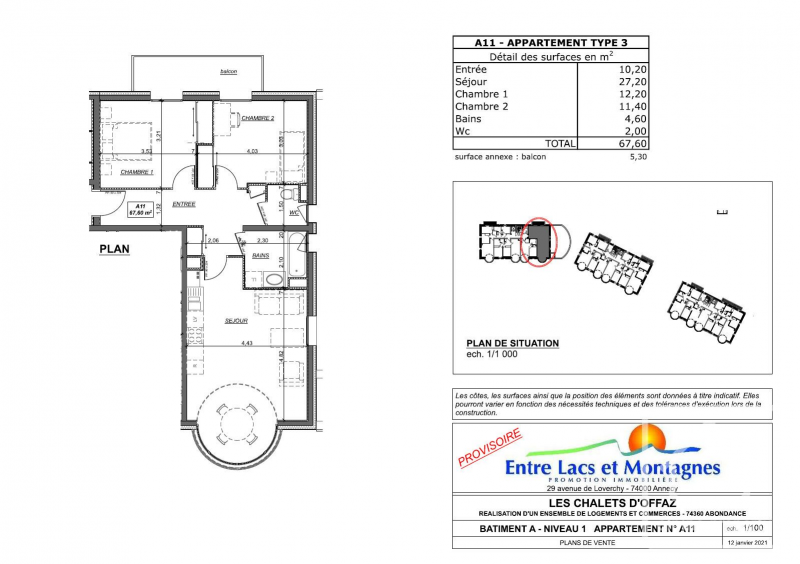 Apartment A11 is a two bedroom apartment of 67.60 sq m. Located on the first floor it comprises a spacious entrance hall with storage, two bedrooms with balcony overlooking the village and the valley, a bathroom and separate WC, an open plan kitchen (not included in the price, budget from 8000 €) and a south facing “LUMICENE” bay window which allows you to have your balcony inside or outside depending on the weather.