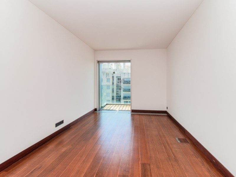 Flooring Flooring in solid Ipê wood. . Skirting board: embedded in the wall in solid Ipê wood. Walls Ladriplast masonry covered with solid Ipê wood with acoustic and thermal insulation and plastered and painted. Light wall aluminum structure with frosted glass on both sides with interior lighting (only in plumb B). Plastered and painted ceiling. Sun protection motorized interior screens. Lighting Light points on the walls and floor. Balcony doors Vitrocsa embedded aluminum frames with double thermal glass (thermo-hardened exterior and laminated interior). Multimedia Telephone points, data network (internet), cable, radio and wireless.