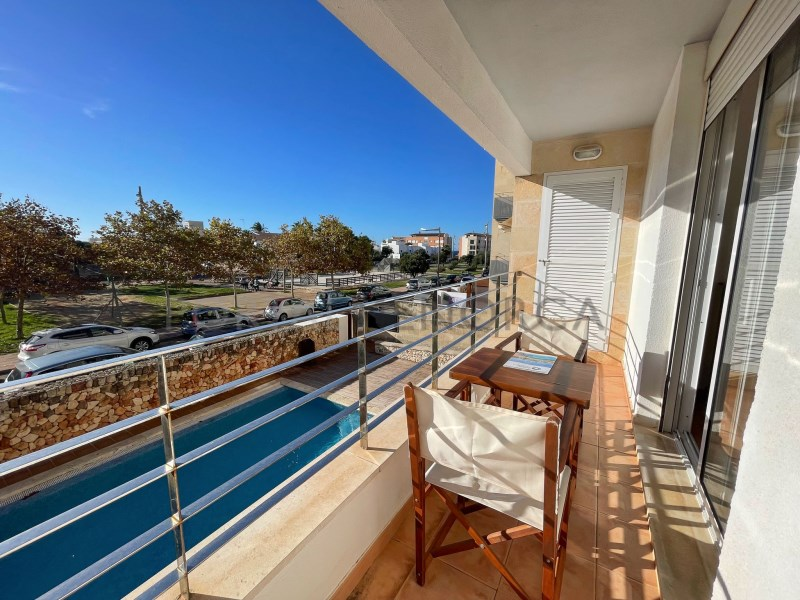 Upon entering, a hallway with a built-in wardrobe leads to the sleeping area, featuring a main bedroom with fitted wardrobes, a second bedroom, and a full bathroom. The living area opens up into a bright living-dining room with an open-plan kitchen, bathed in light from large windows that open onto a corner balcony with open views over the pool and park the perfect spot to relax and enjoy Ciutadella's beautiful sunsets.