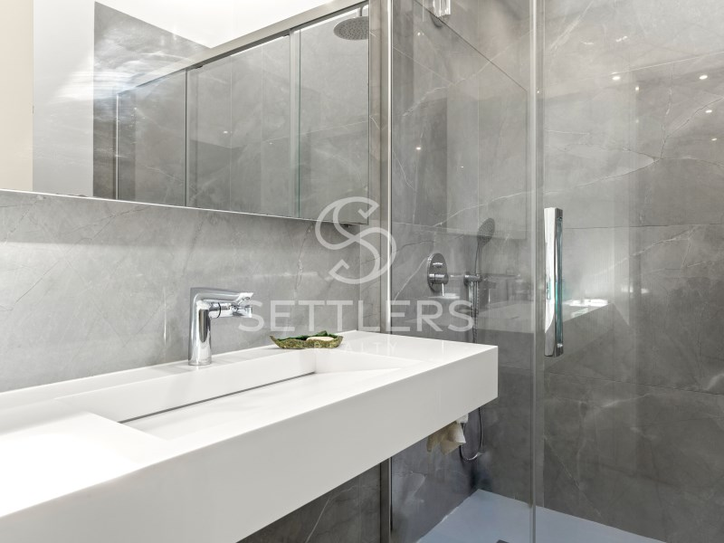 T2+1 Apartment comprising: living room (40 m²) with mezzanine (25 m²) creating a versatile extra space, kitchen (8.7 m²), master suite (38.4 m²) divided into two areas, with full bathroom with walk-in shower, office (8.2 m²) and additional bathroom with walk-in shower.