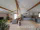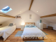 Returning indoors, a small hallway provides access to the master bedroom and the staircase to the upper floor. The master suite is complete with a closet area and a stylish en-suite wet room. Upstairs, there is a third bedroom, also generously sized, with wooden floors and exposed beam ceilings, adding warmth and character.