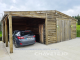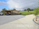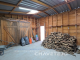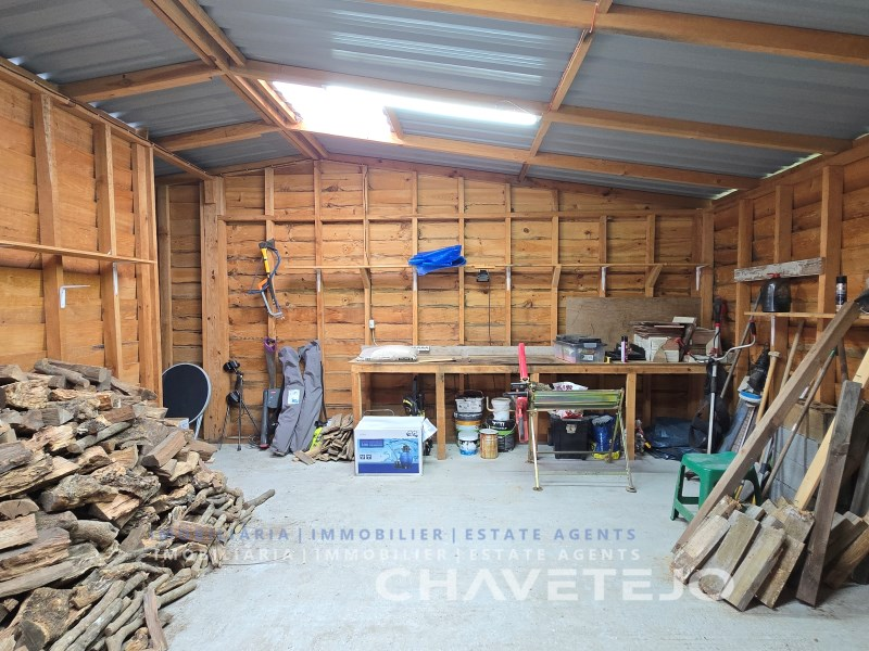 The house is approached by a driveway that gently leads to a parking area. To the right, there is a wooden workshop with an integrated carport, offering ample space for vehicle parking as well as additional storage or workshop use.