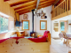 The living room, warmed by a wood-burning stove and framed by a large picture window, takes full advantage of majestic views onto the Criou Mountain.