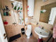 Layout: bright room combining living and kitchen area, a balcony, and a bathroom with shower, toilet, and sink