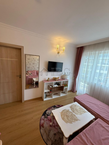 A cozy one-bedroom apartment is for sale in the heart of Sunny Beach. The complex is ideally located for comfortable year-round living, with several supermarkets, shops, a pharmacy, a beauty salon, and other amenities nearby. The apartment is situated on the 5th floor, has an elevator, and is only 600 meters from the sea. Stylishly furnished, it features a living room with a kitchenette, a bedroom, a bathroom, and a terrace.