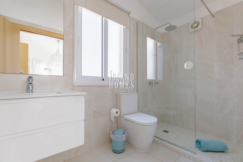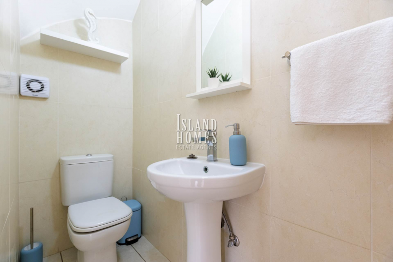 The first floor consists of three spacious bedrooms, all boasting fitted wardrobes, two of these rooms offer patio door access with sea views. The master bedroom benefits from the added bonus of a private, modern, ensuite shower room. The neutral family bathroom with bath, over bath shower and screen also includes a WC and sink with large modern vanity unit, ideal for those extra towels and toiletries.