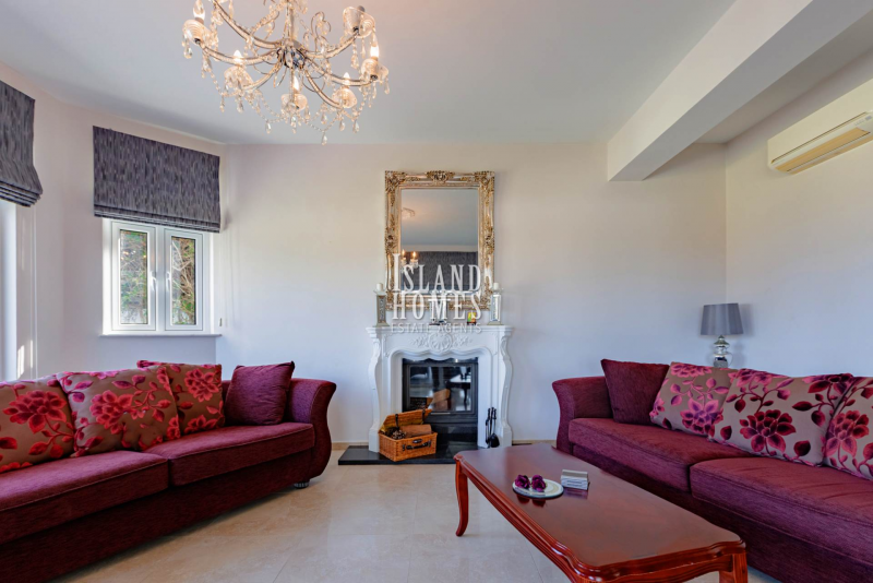 To the right of the stairs is a large, formal, living area, beautifully presented with a further snug` living space through a short corridor. The formal living area has ornate ceiling features and is adorned with a chandelier to complement the style of the property. The `snug` living space offers patio door access to the terrace at the back of the property as well as beautiful garden and sea views. The snug room boasts an open fire place, ideal for those short winter months by the coast. The ground floor also includes a separate utility room, convenient guest WC and offers access, by stairs, to the underground parking area.