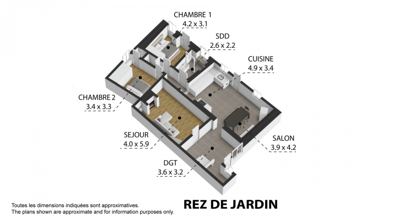 The apartment comprises thus: Entrance hall, open plan dining room/kitchen, hallway, shower room with double sink, WC, two double bedrooms, vaulted living room, hallway, second entrance, office/studio space upstairs. Direct access from the kitchen/dining room to large south-facing terrace.