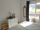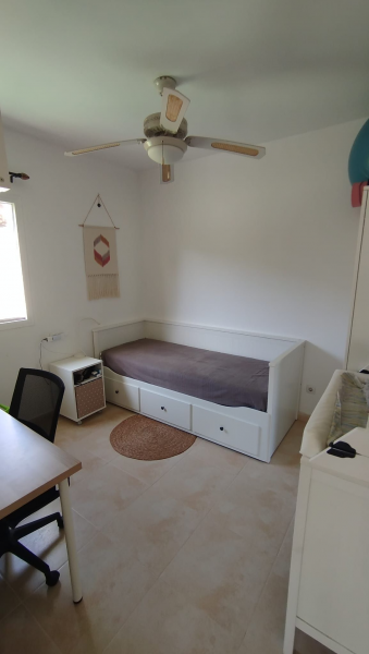 Continuing from the living area, on the right is the first bedroom, with a window overlooking the patio. Currently designed as a children’s room, its generous size allows it to be easily used as a second double bedroom or guest room.