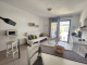 Through the large patio door, you enter the private terrace, a bright corner overlooking the inner gardens, ideal for outdoor breakfasts or enjoying a sunset drink. From here, the open-plan living area combines the lounge and kitchen harmoniously, creating a welcoming and luminous environment, perfect for relaxing or entertaining.