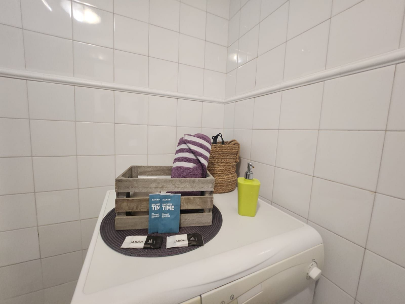 A corridor on the left leads to the fully equipped bathroom with shower and continues to the master bedroom, bright and cozy, a true retreat to relax after a sunny day.