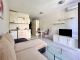 Open-plan living room with kitchen – includes sofa, air conditioning, refrigerator with freezer, hob, extractor fan, dining table with two chairs, kitchen utensils, and cookware