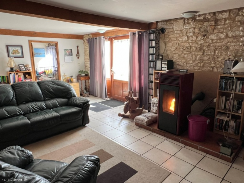 -Living room (29m2): tiled floor, pellet stove, exposed stone